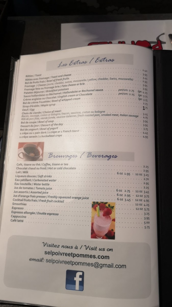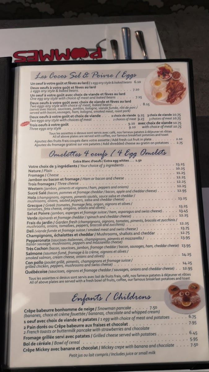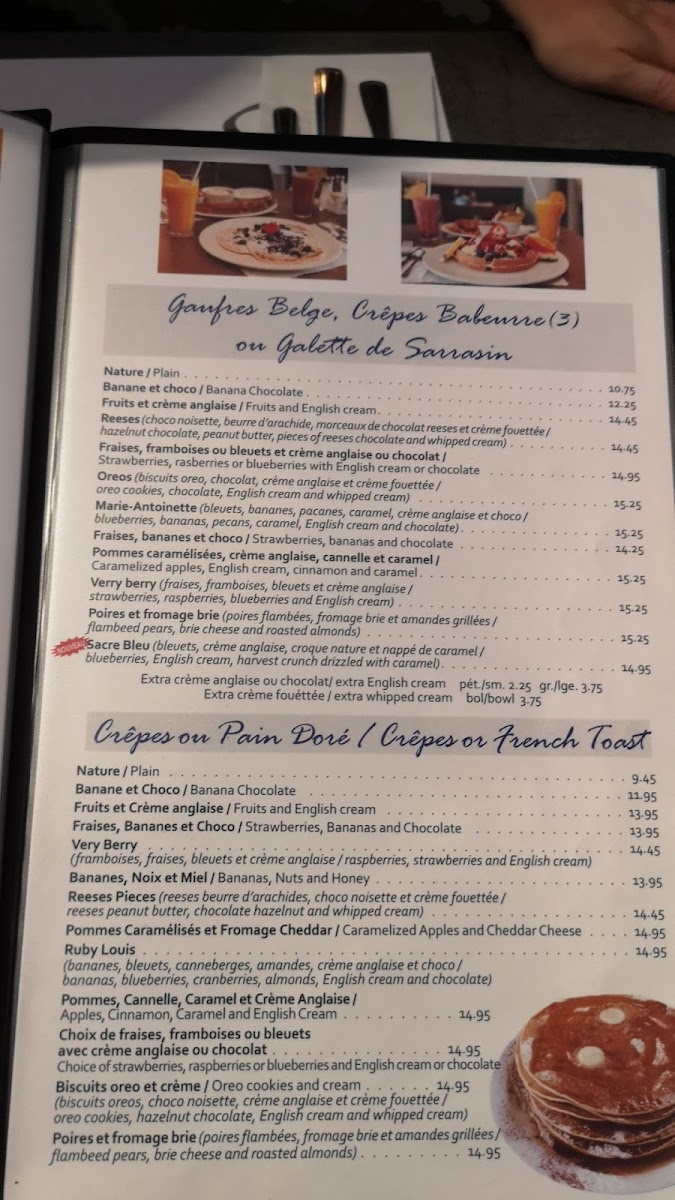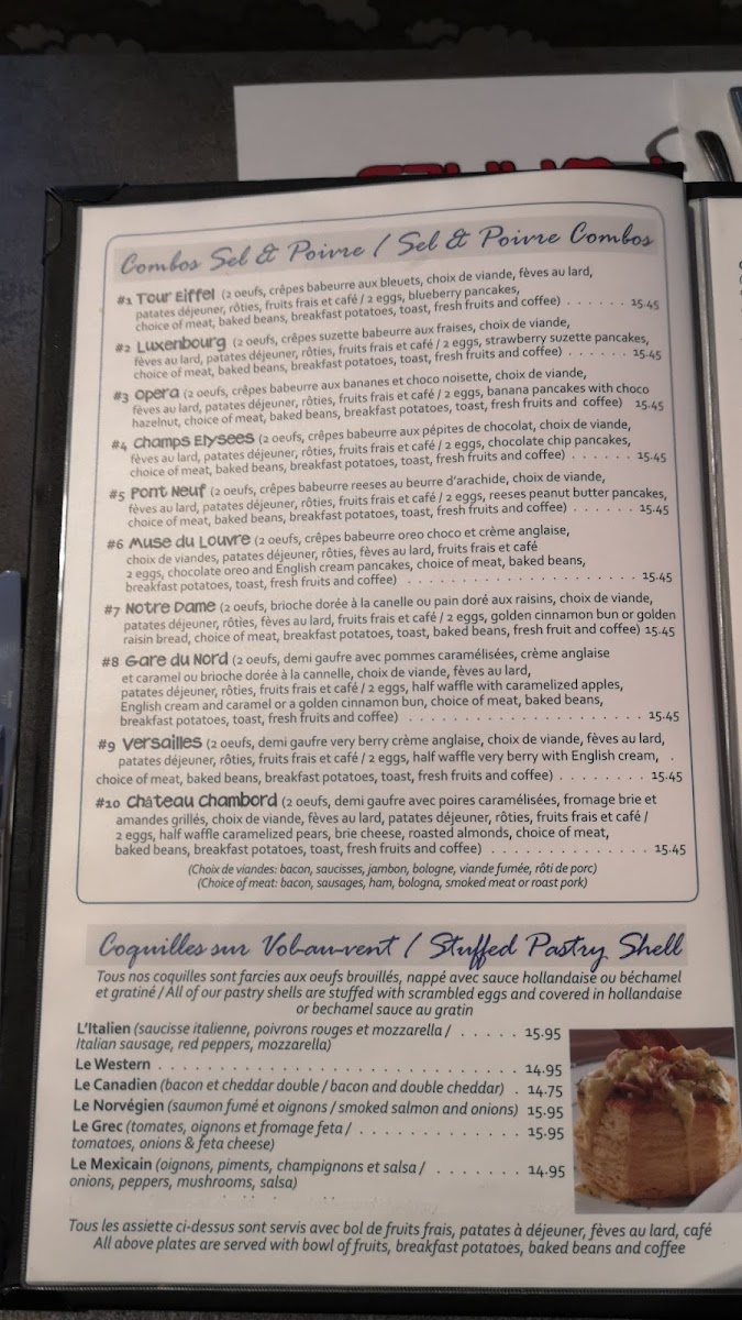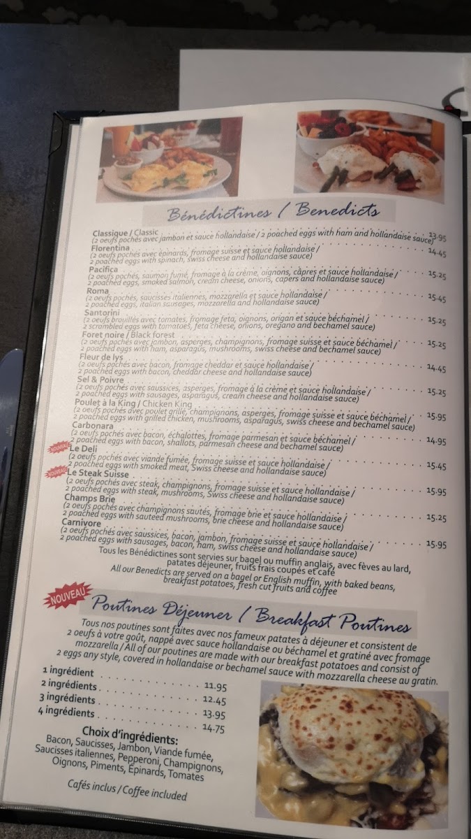 Tous les assiettes si dessus sont servis avec bol de fruits frais, café, nos fameux patates à déjeuner et rôties / All plates are served with a fresh bowl of fruits, coffee, our famous breakfast potatoes and toast